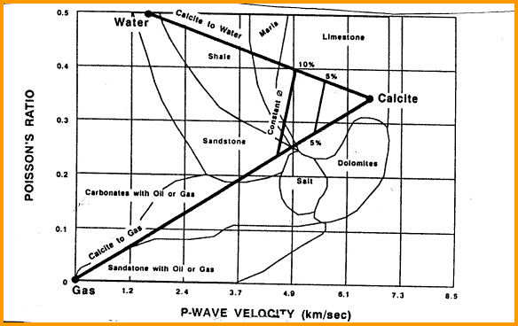 A plot of Poisson's ratio versus compressional velocity, below, shows the effect of lithology and gas. Values for Poisson's ratio are also listed in Table 1 near the end of this Chapter.