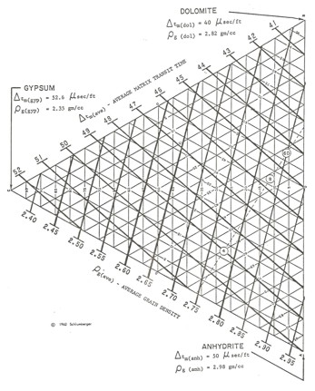 Four simultaneous equations can be solved using triangular graph paper, such as that shown at the right. The corners of the plot represent 100% of the three major rock components. An overlay of log value lines are drawn to linearly interpolate between corners so the log data can be plotted and lithology determined. Once the three rock volumes are found, porosity is calculated from an appropriate porosity log response equation. Triangular graph paper to solve for lithology In order to illustrate the variety of models which can be solved by simultaneous equations. Five examples are cited here.